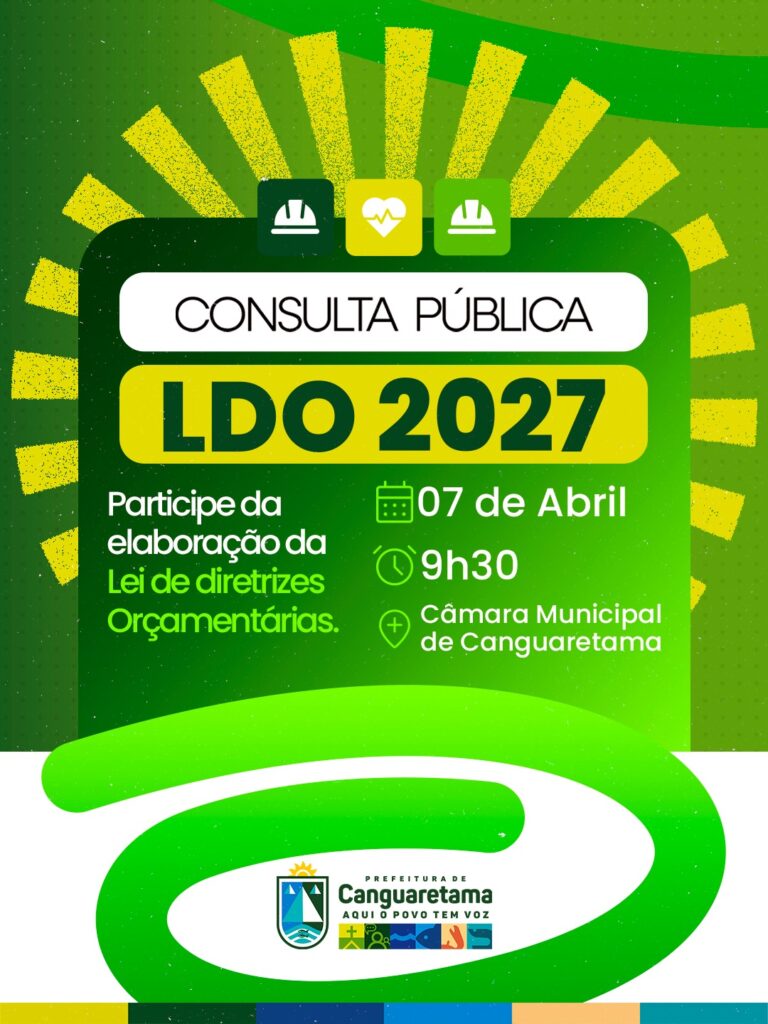 A Prefeitura Municipal de Canguaretama promoverá, no próximo dia 07 de abril, às 9h30, uma consulta pública para a elaboração da Lei de Diretrizes Orçamentárias (LDO) 2027. O encontro será realizado na Câmara Municipal de Canguaretama e é aberto à participação de toda a população.